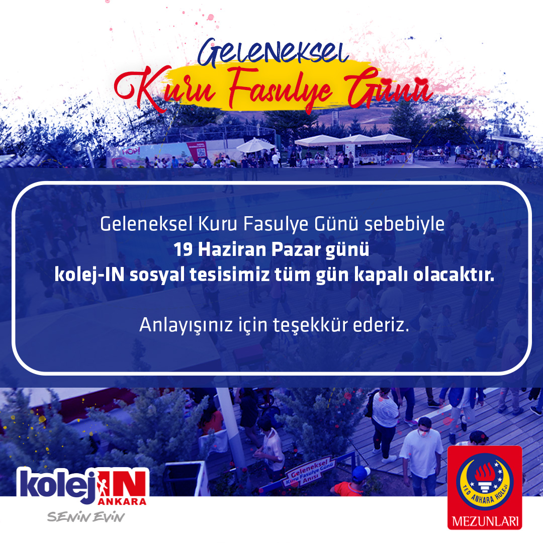 Geleneksel Kuru Fasulye Günü sebebiyle 19 Haziran Pazar günü tesisimiz tüm gün kapalı olacaktır.